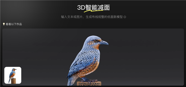 3D智能减面能力,通过自适应生成几百至数千面的三角面,进一步提升几何边缘平滑度,生成结果可在低面片的基础上最大化体现模型细节,让模型布线更加规整,以降低渲染难度,提升模型可用率及生产效率。