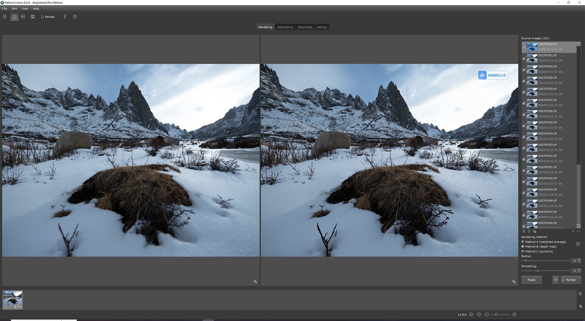 富士GFX100II内置了对焦包围功能,使用此功能拍摄后,相机会自动运行程序,拍摄同场景不同焦点的照片,并将所有拍摄照片存放在同一文件夹内。之后在电脑端借助后期软件操作即可获得景深合成照片,整个步骤非常简单。
