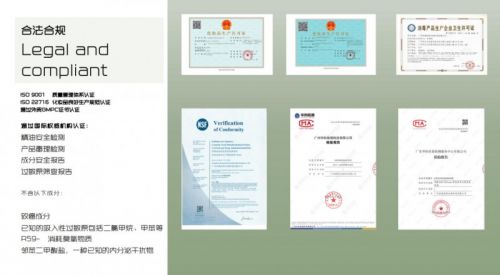 维怡美深知,护肤品的安全性是消费者选择品牌的首要考量。为此,企业通过了多项国际权威认证,包括ISO9001质量管理体系认证、ISO22716化妆品生产规范认证以及外贸GMPC认证,确保产品不仅符合国内标准,更能出口国际市场。这些认证不仅是维怡美对品质的承诺,更是对消费者安全的保障。