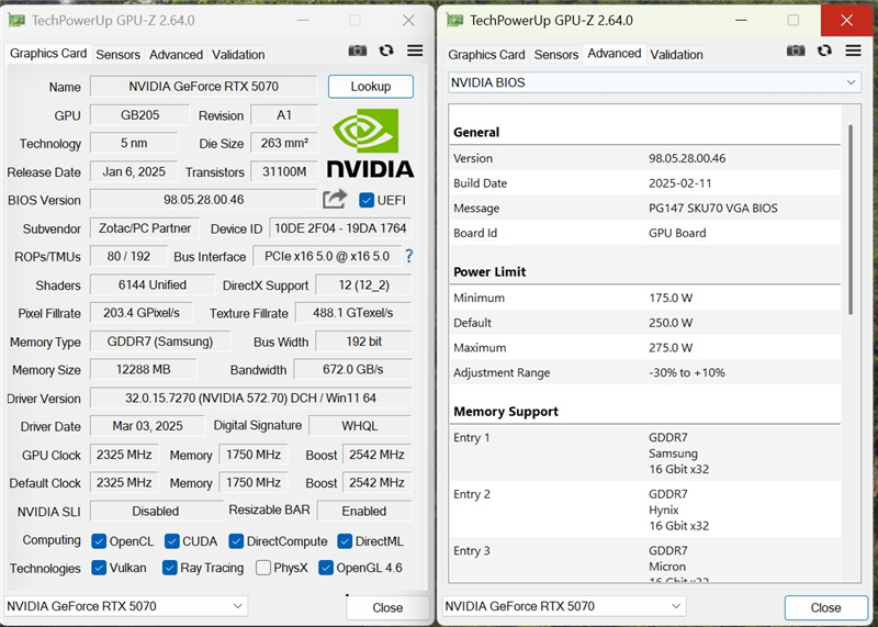 从GPU-Z的截图中可以看出,索泰RTX 5070 SOLID OC的加速频率比公版高了30MHz,TDP同样都是250W,但可以通过超频软件拉到275W。