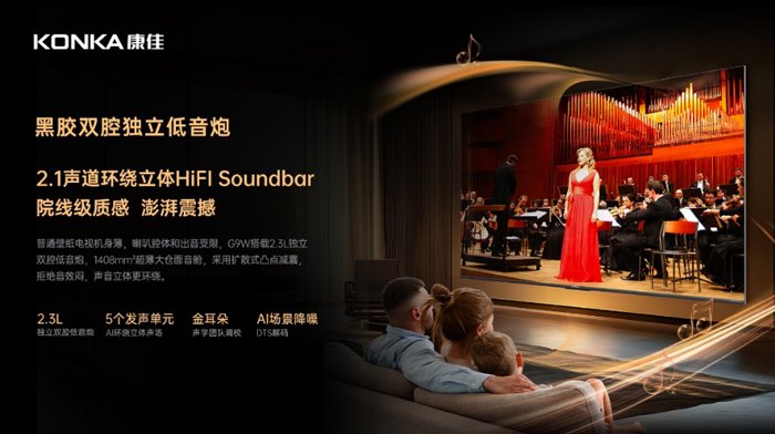 在音质表现上,康佳G9W配备了2.3L黑胶双腔独立低音炮,显著增强了低频表现,使得低音更加浑厚有力。无论是电影中的爆炸场面、战斗场景,还是音乐中的鼓点、贝斯等低频元素,都能得到清晰且深沉的呈现,带来层次十足的听觉体验。