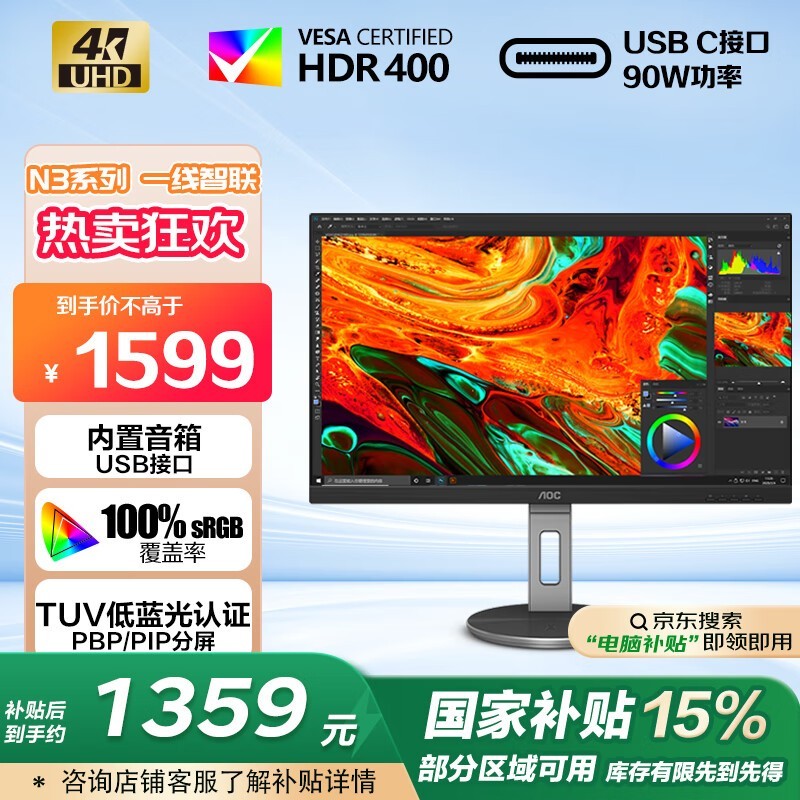 AOC U27N3R显示器京东优惠价低至1335元