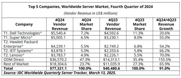 数据显示,ODM直接供应商(如戴尔、超微、惠普、联想等)在服务器市场中占据主导地位,市场份额约为47.3%,并取得了155.5%的年增长。2024年第四季度,ODM厂商的收入达到365.7亿美元,成为市场增长的主要推动力。