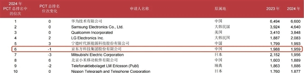 其中,京东方以1959件PCT专利申请量位列全球第6,连续9年进入全球PCT专利申请TOP10。