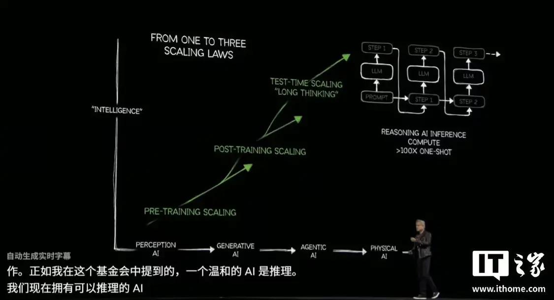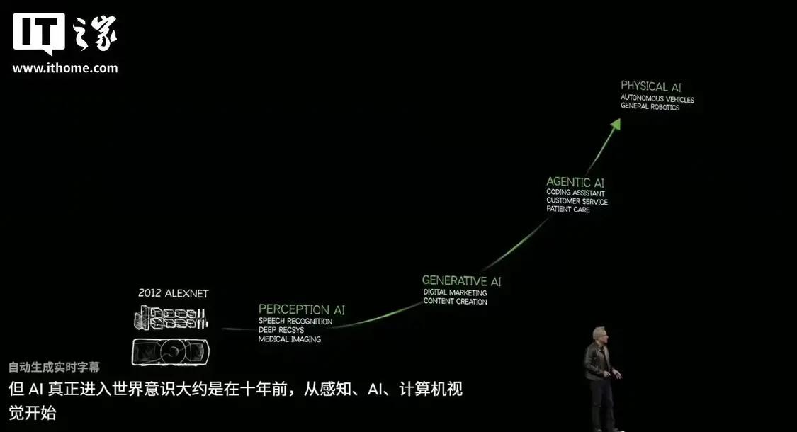 黄仁勋一上来就提到了AI发展的未来,现在我们处于生成式AI(Generative AI)阶段,但根据黄仁勋的路线图,我们将迈向一个代理式AI(Agentic AI)时代,随后是物理 AI(Physical AI)—— 机器人登场的时候。