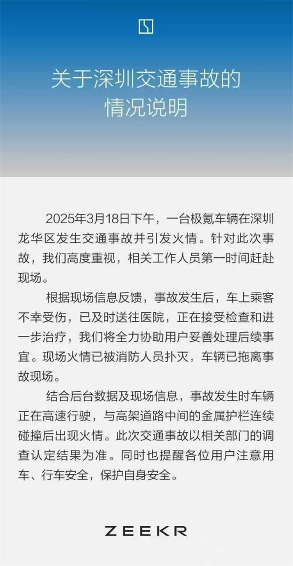 2025年3月18日下午,一台极氪车辆在深圳龙华区发生交通事故并引发火情。针对此次事故,我们高度重视,相关工作人员第一时间赶赴现场。
