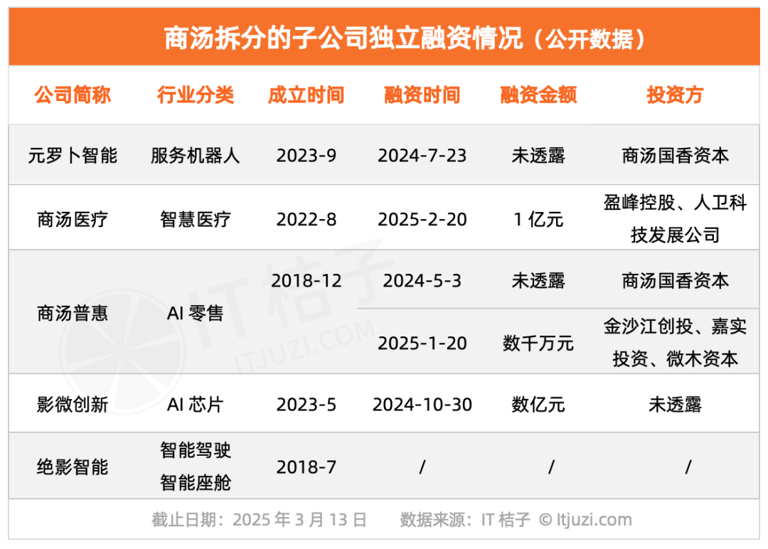 除零一万物外,IT 桔子发现,还有两家曾是独角兽、现为AI上市公司的商汤科技、地平线,近几年也热衷于分拆业务。