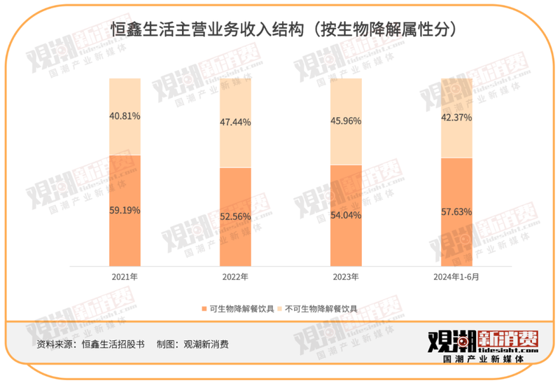 招股书显示,按生物降解属性分类,恒鑫生活的产品分为可生物降解餐饮具和不可生物降解餐饮具。2021 年、2022 年、2023 年、2024年1-6 月(下文简称“报告期”),可生物降解产品的营收占比为59.2%、52.6%、54.0%、57.6%。