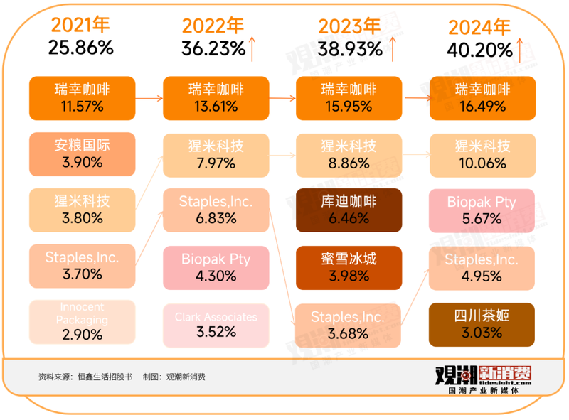 2021年起,瑞幸一直是恒鑫生活的第一大客户,喜茶也在2022年从第三升至第二后保持至今。2024年上半年,恒鑫生活前五大客户为瑞幸咖啡、猩米科技(喜茶全资子公司)、Biopak Pty、Staples、四川茶姬(霸王茶姬),前五大客户合计支撑起了恒鑫生活超40%的营业额。