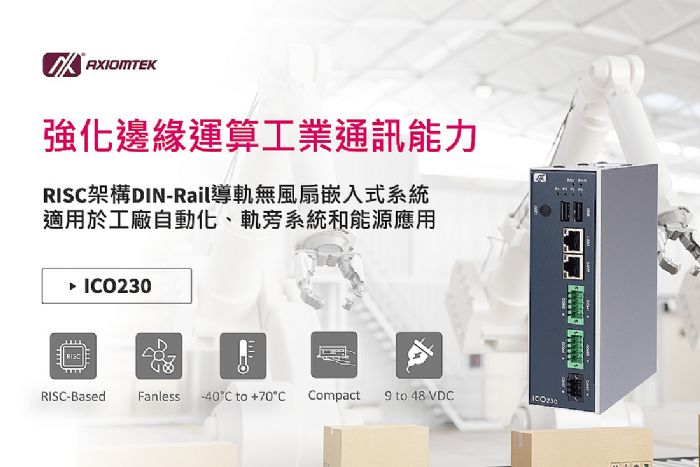 艾讯股份有限公司 (Axiomtek Co., Ltd.) 宣布推出一款强固型无风扇RISC架构嵌入式系统ICO230,专为工厂自动化、交通轨旁系统和可再生能源等高要求应用场景打造。搭载NXP i.MX 8M-Plus处理器,提供稳定的边缘通讯与闸道器功能,并以最小功耗在远端与严峻场域中确保高效且具成本效益地正常运作。