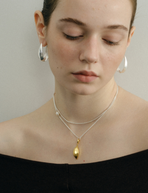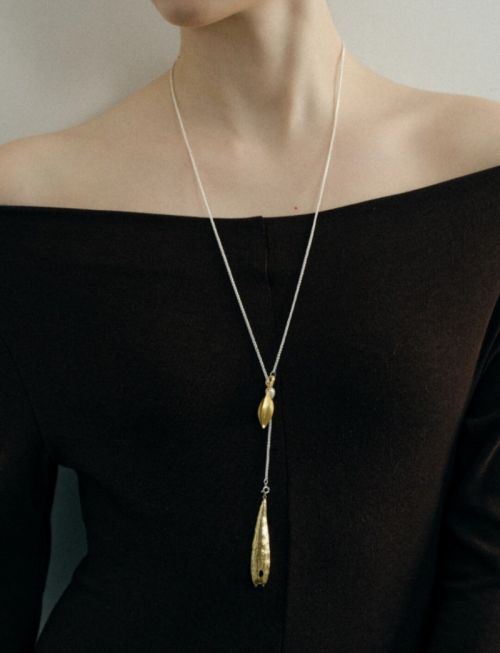 小船壳形似一叶扁舟,又像热带植物的硬挺的叶片,线条流畅自然,吊坠凸面保留了植物自带的细腻的竖条纹肌理,凹面做了独创设计的“彩羽肌理’。模拟彩色鸟儿身上散发绚烂光彩的一层层羽毛纹理流动的光泽和细腻的质感与片彩的结构,展现自然系的艺术美感。设计初衷是想要一条可以满足四季,以及各种佩戴方法的长项链。于是就有了这条金银拼色、双吊坠,可拆卸的果荚项链。