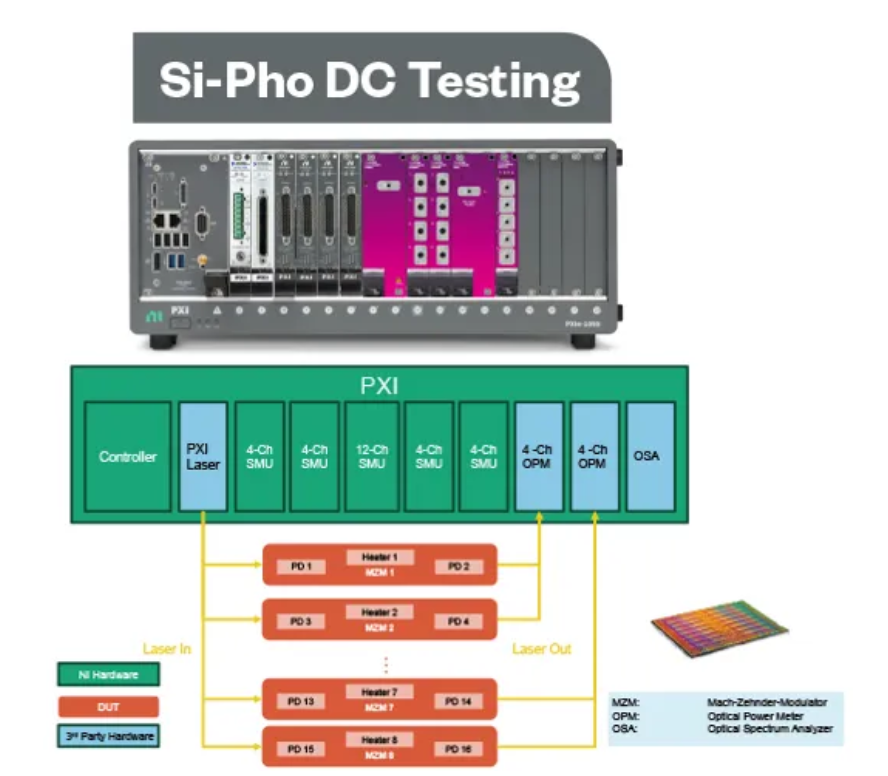 NI为光电子的DC测试提供了优质的解决方案,电学及光学测试仪器和仪表均可集成在同一个PXI平台中,利用NI的软件硬件平台优势,加速光电子测试的效率。