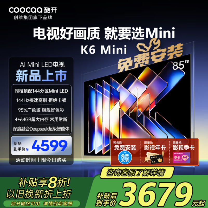 酷开85P5F 85英寸4K电视预售优惠价3639元
