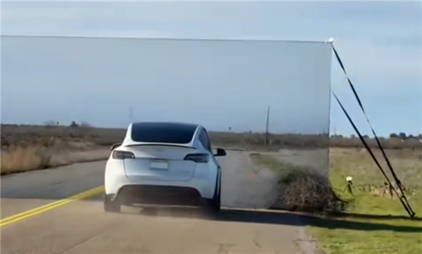 视频中,Mark Rober设置了多个对特斯拉Autopilot功能进行实测的项目,在“泡沫空气墙”测试环节中,他们找来了一副由泡沫制作的假墙,并在上面绘涂道路,远看上去就像一堵真实的“空气墙”。