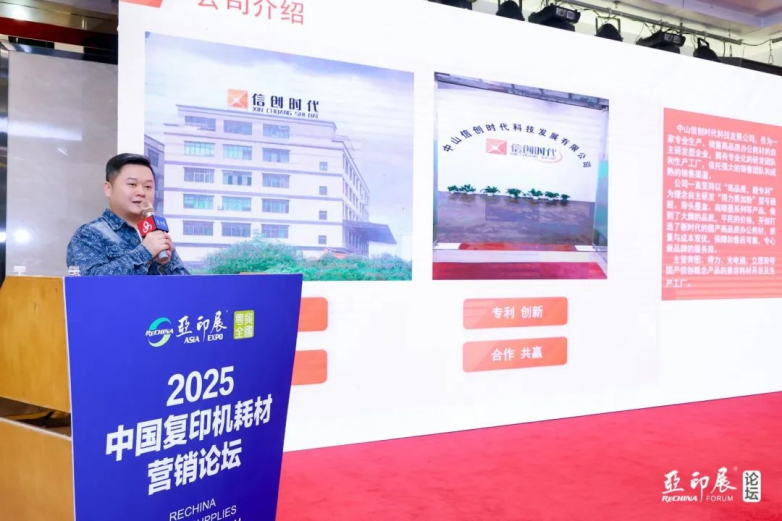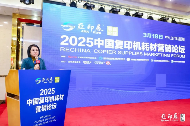 中山市拓思达电子科技向春妮带来《浅谈打印复印耗材出口趋势2025》的主题演讲,分享近期收获与心得,指出复印机市场未来增长态势及出口多元化趋势下企业的应对策略。