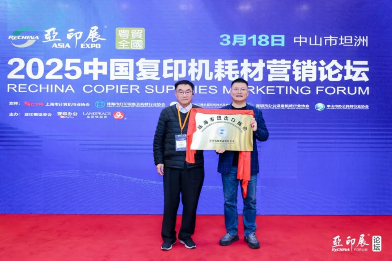 随后,现场举行了珠海市进出口商会复印机技术及耗材分会秘书长单位授牌仪式。当“耗材行业的老爷子”王肖平郑重地将金字招牌授予亚印展组委会时,全场气氛达到高潮,共同祝愿中国复印机耗材行业未来更加辉煌。