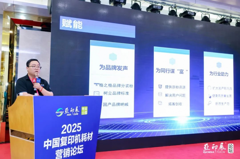 纳思达集团珠海格之格数码科技项目经理黄钱垒围绕公司产品优势、市场战略展开演讲,强调原装耗材在解决市场困境中的重要性。