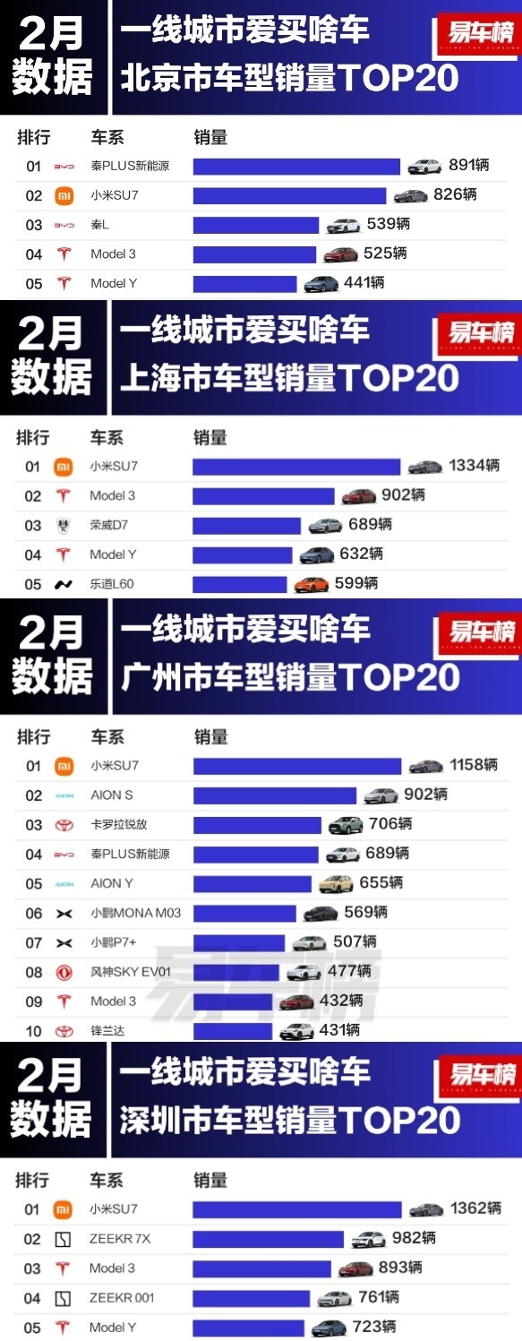 根据媒体整理的2月终端销量数据,北京市车型销量前3名分别为:比亚迪秦PLUS新能源、小米SU7、比亚迪秦L,销量分别为891辆、826辆、539辆。特斯拉两款车型虽然都进入了前五,但加起来的销量并没有比小米SU7高多少。
