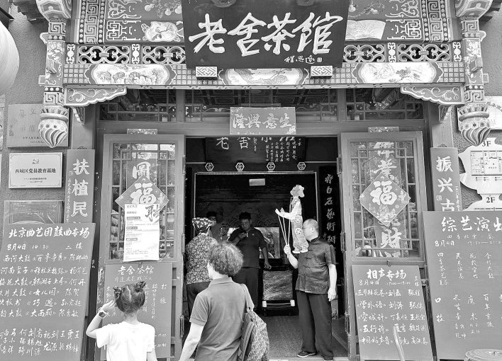 在北京市西城区打造的中轴线西翼非遗体验活动中,文化活动同样丰富多彩。4条线路中,“中轴西韵,薪火相传的京腔”之线则包含老舍茶馆、正乙祠戏楼等点位。其中位于前门西大街的老舍茶馆,古香古色、京味十足,在这里可以欣赏到曲艺、戏剧名流的精彩表演。记者来到茶馆,看到一群小学生围在茶馆门口,听老师现场解说老舍的生平和作品特色。“今日有西河大鼓《百亭争秀》、快板书《巧遇》,还有木偶戏。”茶馆前,店小二热情地招揽着游客。