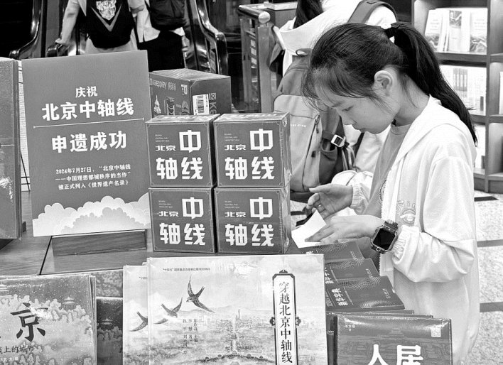 “壮美中轴”主题展是王府井书店为庆祝“北京中轴线”申遗成功特别打造的。从中轴线到京城历史文化以及人文风情,展区内的图书品种丰富多样,为读者呈现了一个“微缩版”的“北京中轴线”。记者从书店了解到,该主题展区打造已有两年,是书店助力中轴申遗、向公众集中展示“北京中轴线”、京城历史文化、人文风情图书及文创产品的特色区域。此外,书店还在公众号推荐主题书单,如《北京中轴线》《北京中轴线史话》等,与广大读者共话古都文明。