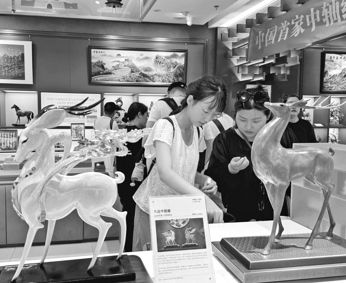 而在位于同一条街的朱炳仁中轴线艺术馆内,“非遗铜学堂”手作互动体验区也吸引许多小朋友。他们在店员的指导下动手体验拓铜画制作的全过程。朱炳仁中轴线艺术馆以“北京中轴线”为创作灵感,《九运中国鹿》等作品引发游客惊叹连连。店内的工作人员介绍,近年来,朱炳仁、朱军岷父子与景泰蓝大师张同禄、玉雕艺术大师张铁城等“燕京八绝”非遗传承人携手合作,创作了一系列独居匠心的作品,让“燕京八绝”的传统技艺焕发新的生命活力。