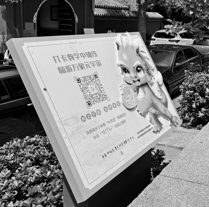 记者发现,中轴线上的多个景点都设置了二维码,游客扫一扫就能通过数字技术了解更多景点故事。如位于什刹海边的火神庙,设有一个“万象中轴”数字文化体验项目打卡体验点,记者扫描下载灵图游APP,即可身临其境地感受“北京中轴线”上各类建筑、景观的魅力。