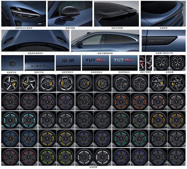 相较此前申报信息,小米YU7此次公布了更多的选装配件。包括二十多款颜色的选装轮圈、扰流板以及碳纤维装饰件。