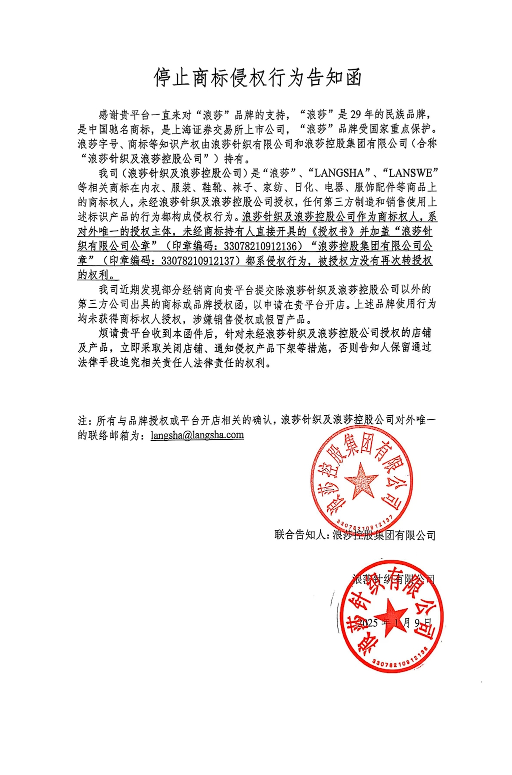 2025年1月9日,浪莎在官网贴出发给某平台的停止商标侵权行为告知函,提到发现部分经销商向平台提交除浪莎以外第三方公司出具的商标或品牌授权函,以申请开店。该行为未获得商标权人授权,涉嫌销售侵权或假冒产品。