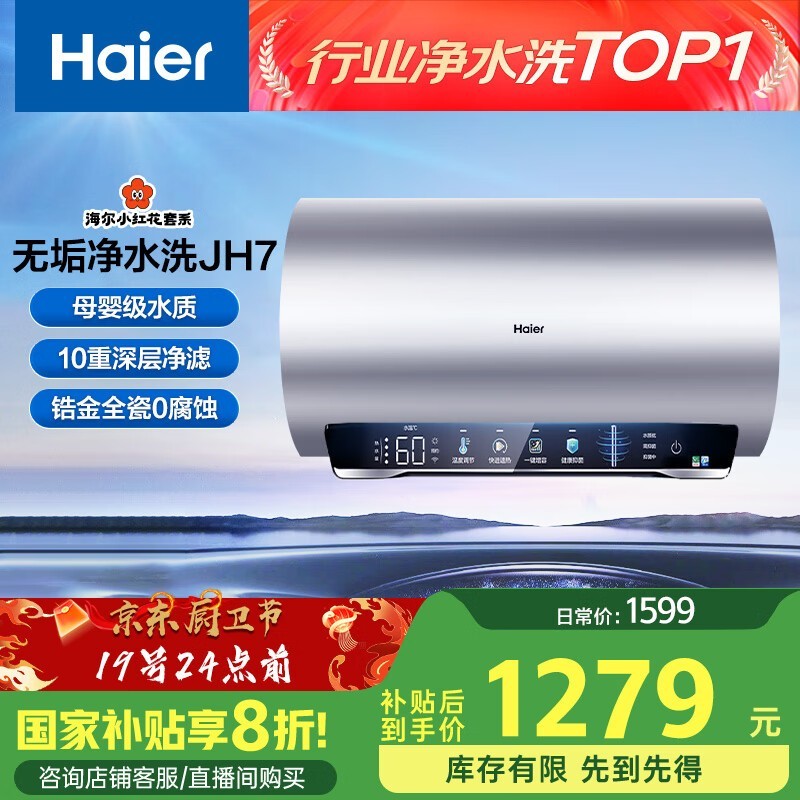 海尔60升电热水器变频速热美肤净水洗一级能效