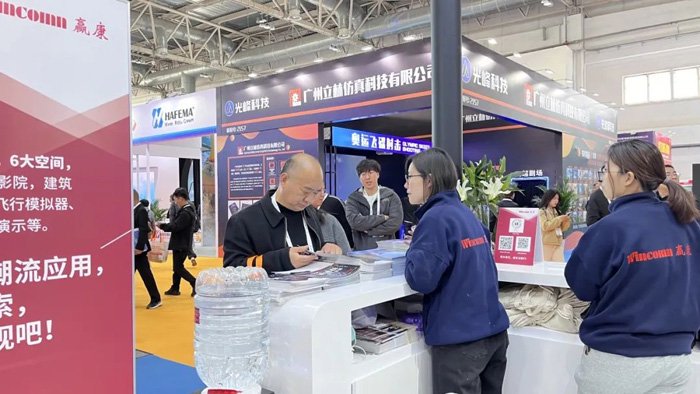 展位上最重要的展项,就是赢康科技全新升级的“6K球幕飞行影院”体验项目,这个展项在现场获得了很高的人气,众多想体验的观众在赢康展位排起了长队。