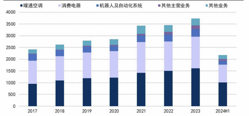 截至2024H1,空调是美的第一大业务,收入占比达到 46.7%;消费电器业务收入占比达到 34.58%;机器人与自动化收入占比则为8.42%。虽然有B端业务,但美的还是以C端为主,这么些年来各业务板块占比整体来说还是比较稳定。
