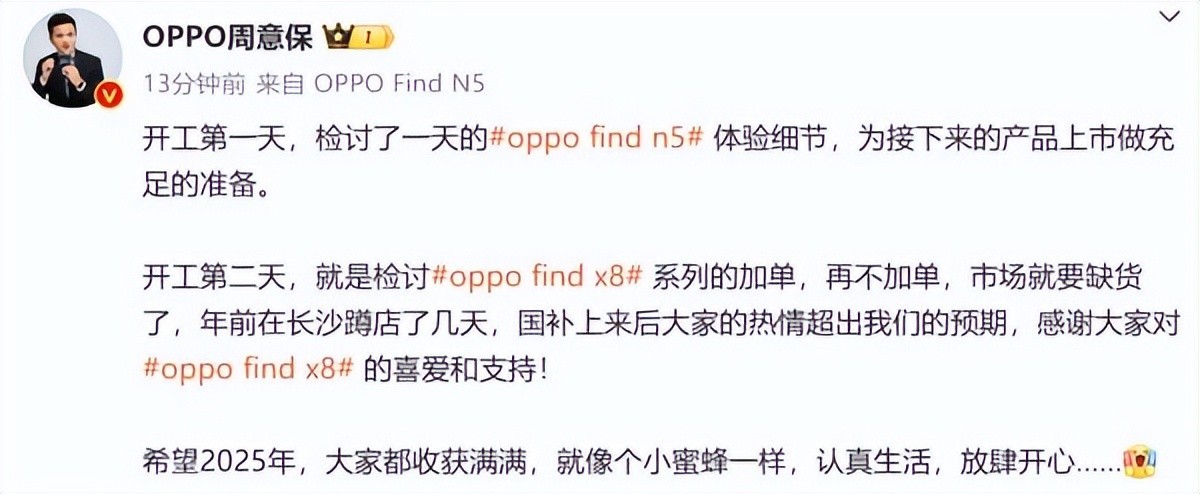 ??OPPOFind X8系列的成功并非偶然,OPPOFind系列的产品负责人周意保在近期的发言中也透露了这一系列的销售盛况。他表示,由于市场反应热烈,OPPO正在紧急调整生产计划,以防市场出现缺货现象。周意保在春节期间亲自到店观察,发现消费者对FindX8系列的购买热情远超预期,尤其是在国家补贴政策的推动下,消费者的购买力得到了显著提升。