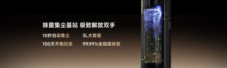 智能自集尘基站让清洁更加便捷,10秒极速自集尘,3L密封尘袋可容纳长达100天的灰尘垃圾,用户无需手动倒尘。基站在除菌模式下释放等离子,对尘袋仓的杀菌杀毒率高达99.99%。压力传感器可感知尘袋仓压力变化,尘满后及时提醒用户更换尘袋。此外,基站还具备整机收纳和自动充电功能。