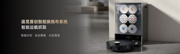 针对用户对健康生活的深层次需求,追觅科技此次推出了首创智能换拖布技术。当扫地机器人进入基站后,可以借助智能运载系统实现脏拖布的拆卸;扫地机器人离开基站后,运载装置会将脏拖布移至空位处,并将干净拖布至于底部托盘位置;扫地机器人回到基站后,自动安装新拖布就可以继续开展清洁作业。该系统能够自动识别不同区域的清洁需求,如厨房、卫生间等易污染区域,自动更换专用拖布,避免交叉污染。同时,还能根据地面材质和污渍类型,智能调节清洁模式和力度,实现更加精细化的清洁效果。