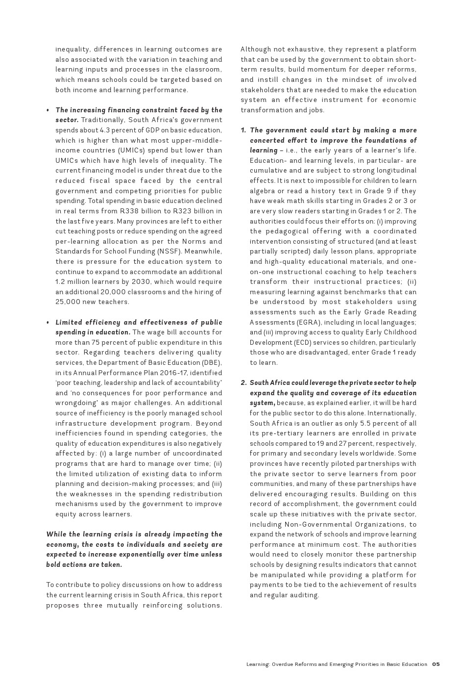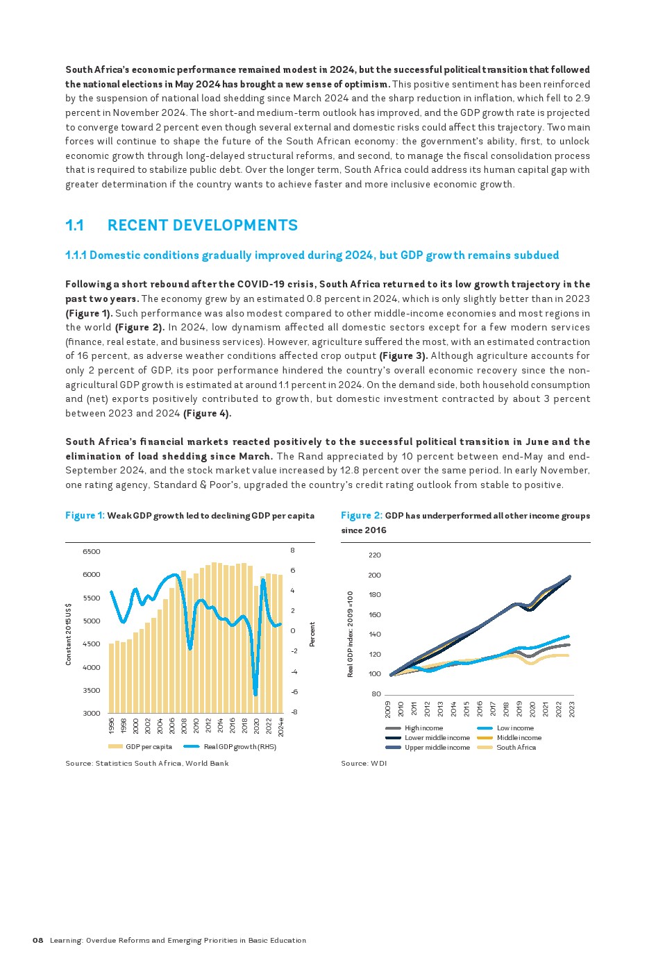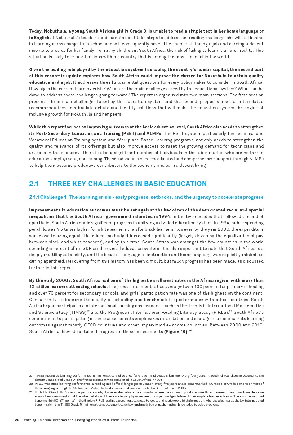 尽管二十年来南非在提高优质基础教育普及率方面取得了进展,但该国仍面临多维度的学习危机。在种族隔离政策结束后的二十年里,南非成功地为几乎所有儿童提供了基础教育的机会,并开始纠正种族隔离政策时代根深蒂固的不平等现象。到2000年,小学的毛入学率平均超过100%,中学的毛入学率超过70%,女孩的参与率是非洲大陆最高的之一。该国在学习方面也取得了显著进展,数学、阅读和科学成绩持续提高。尽管起点较低,但这些成绩逐渐接近为经合组织(OECD)国家设定的“低”国际学习基准。尽管到2016年教育水平有了显著提高,但南非仍面临学习危机,同时面临资金限制以及公共教育支出效率低下和公平性不足的问题。
