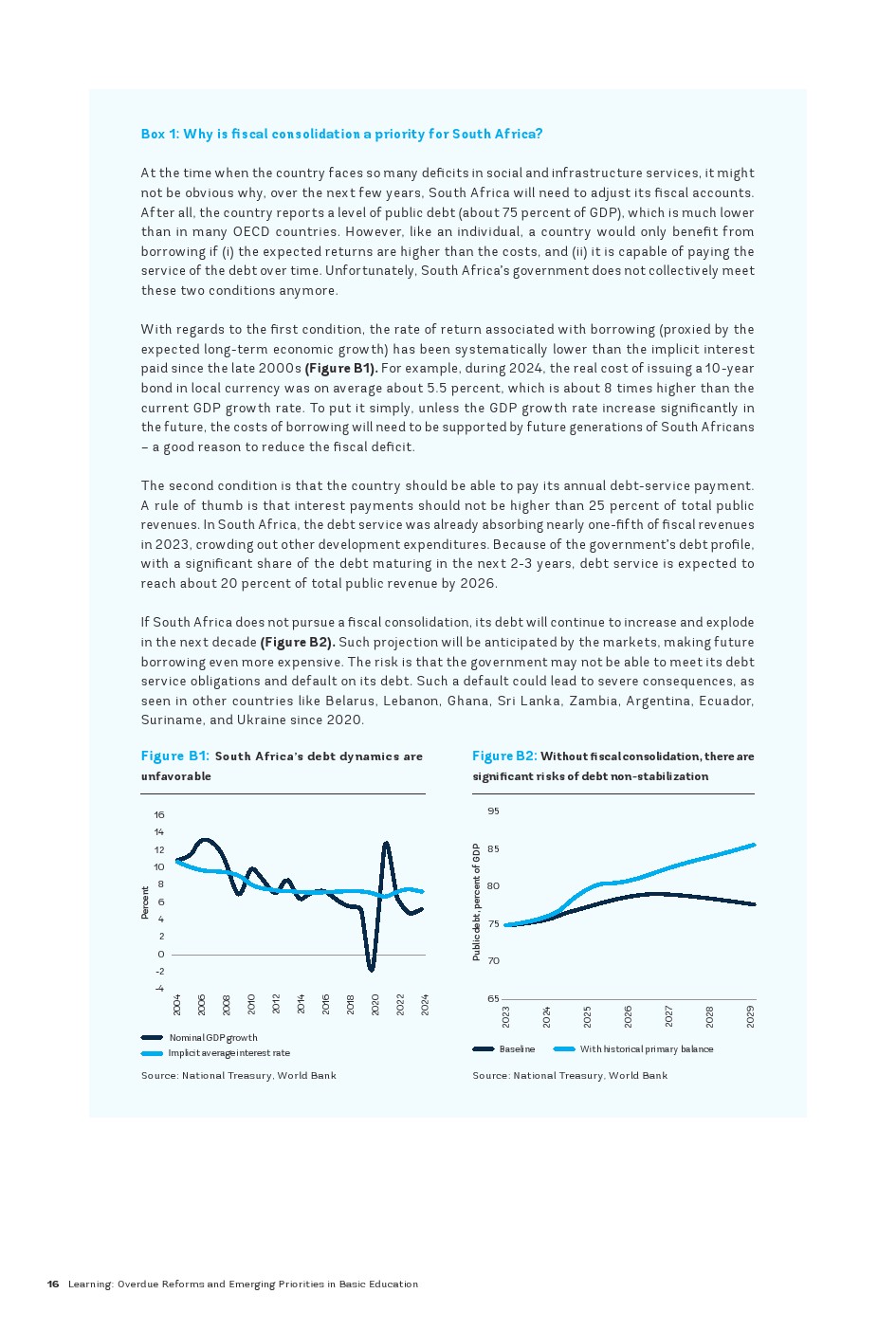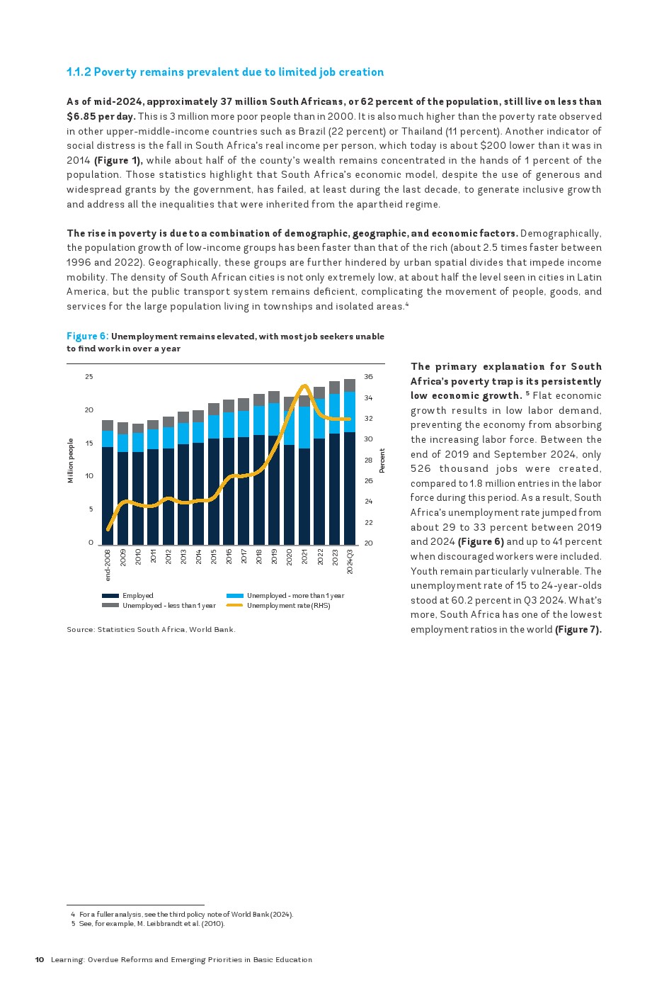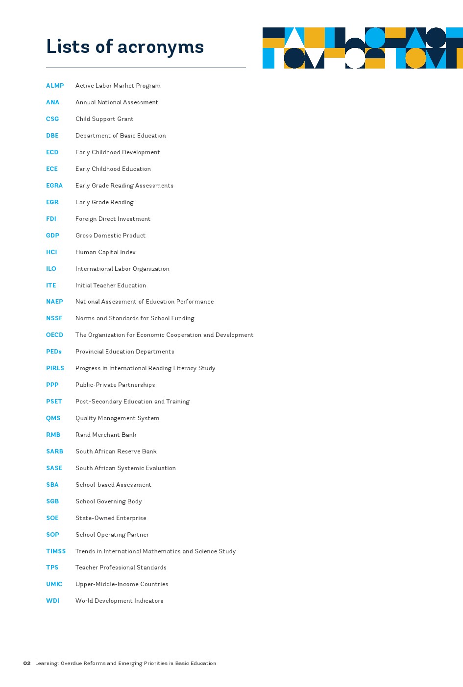 尽管二十年来南非在提高优质基础教育普及率方面取得了进展,但该国仍面临多维度的学习危机。在种族隔离政策结束后的二十年里,南非成功地为几乎所有儿童提供了基础教育的机会,并开始纠正种族隔离政策时代根深蒂固的不平等现象。到2000年,小学的毛入学率平均超过100%,中学的毛入学率超过70%,女孩的参与率是非洲大陆最高的之一。该国在学习方面也取得了显著进展,数学、阅读和科学成绩持续提高。尽管起点较低,但这些成绩逐渐接近为经合组织(OECD)国家设定的“低”国际学习基准。尽管到2016年教育水平有了显著提高,但南非仍面临学习危机,同时面临资金限制以及公共教育支出效率低下和公平性不足的问题。