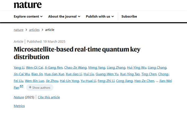 今天凌晨,国际学术期刊《自然》杂志在线发表了该研究成果,杂志审稿人称赞该成果是“技术上令人钦佩的成就,展示了卫星量子密钥分发技术的成熟,代表了实现量子和经典通信卫星星座的里程碑。”