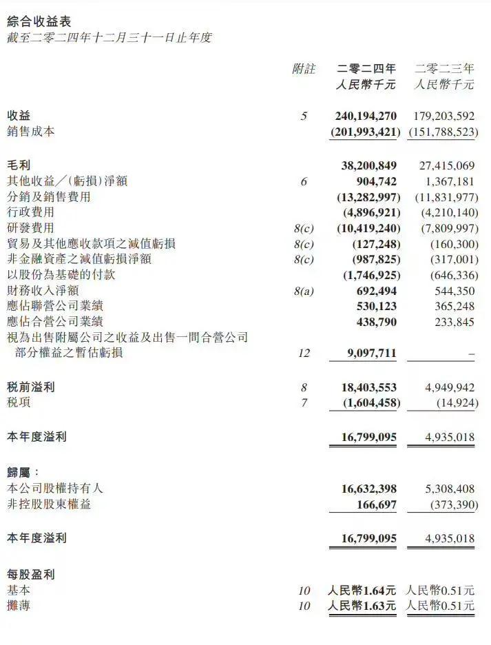 吉利汽车2024年营收达2401.94亿元,同比增长34%;归母净利润大幅增长213%至166.32亿元。每股基本盈利为人民币1.64元,董事会建议派发末期股息每股0.33港元。