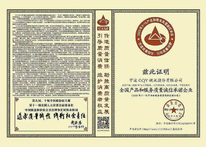荣誉是褒奖,也是品质为先的见证。中国质量检验协会作为全国质量检验行业组织和质量专业权威机构,已连续25年携手全国产品和质量诚信示范企业组织开展产品和服务质量诚信承诺主题活动,该活动已经发展成为国内具有重大影响力的3·15活动。315奖项是中国质量检验协会和全国消费者对GQY视讯的肯定,更是对公司持之以恒践行“为您创造优质”经营服务理念的褒扬。