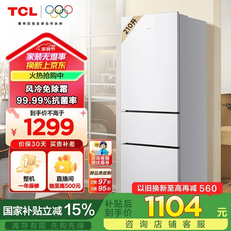超薄设计TCL R210V5-C三门冰箱:小户型的理想选择,风冷恒温静音,210L大空间仅售1299元