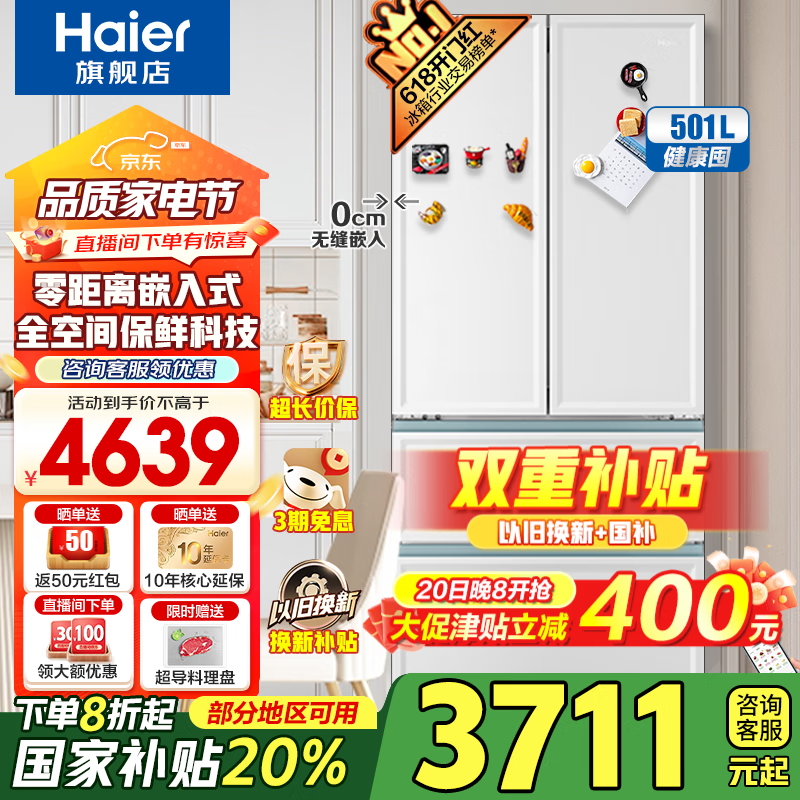 海尔501升零嵌法式多门冰箱到手价3531元