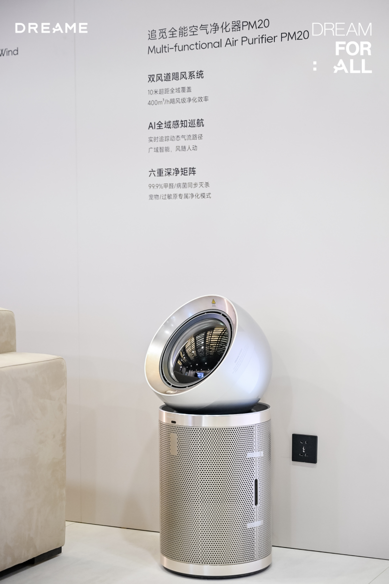 在展会现场,追觅空气净化器PM20仅凭外观设计就吸睛无数,它的造型颠覆了传统空气净化器的刻板形象,其上半部分采用悬浮式球形头部设计,灵感巧妙融合了宇航员头盔与星际飞船的科技感,极具未来主义风格。同时,机器头部可180°转动,赋予机器鲜活的生命力,成为空间里的科技美学艺术品。钛金与银灰的经典配色,经光哑材质碰撞与细腻金属拉丝工艺精心雕琢,在呈现强烈未来感的同时,又能与各类现代家居风格完美适配,毫无违和感,轻松融入不同空间环境。
