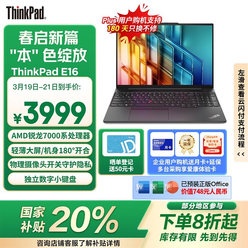 ThinkPad E16 16英寸笔记本电脑高效办公仅3899元