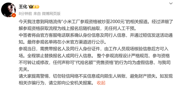 王化回应小米工厂参观资格被炒至2000元:资格不可转让
