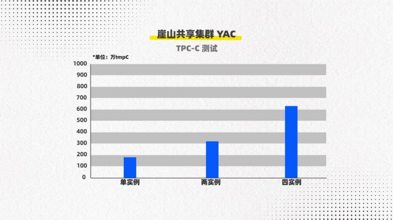 以 TPC-C 测试为例,崖山共享集群 YAC(YashanDB for Cluster)4 节点两路 Intel 服务器测试 tpmC 为 618 万。