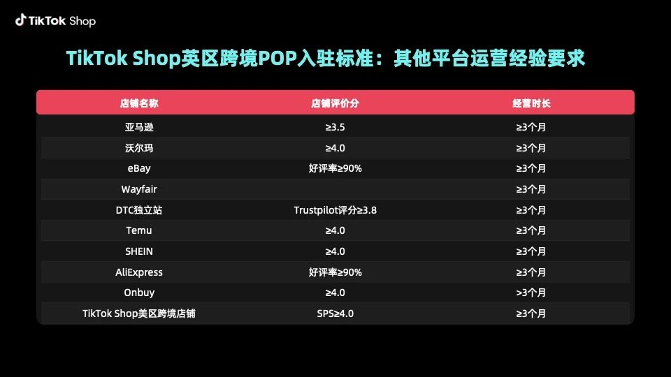 根据官方公告,本次升级支持拥有亚马逊、沃尔玛、eBay等10个主流平台、DTC独立站及TikTok Shop美区跨境店铺运营经验的商家入驻,需满足以下条件:与原平台经营主体一致、第三方店铺评分达标且运营超3个月,并持有英国VAT税号及本地发货能力。目前仅限公司主体入驻,暂不支持个体户及个人独资企业。