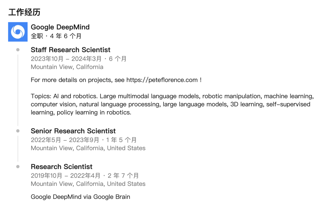 根据其领英个人资料,Florence 一年前离开了 DeepMind。他加入了 DeepMind 前同事的行列 —— 选择一条喜欢的赛道,创办自己的公司。