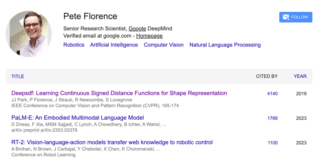 4 年多的谷歌 DeepMind 生涯中,Pete Florence 参与了很多项具备里程碑意义的机器人和大模型研究,其中最具代表性的有 PaLM-E、RT-2。