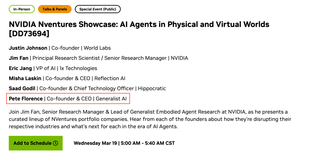 在近日召开的英伟达 GTC 的一个小组讨论会上,谷歌 DeepMind 高级研究科学家、RT-2 作者 Pete Florence 以 Generalist AI 联合创始人兼首席执行官的身份出席。