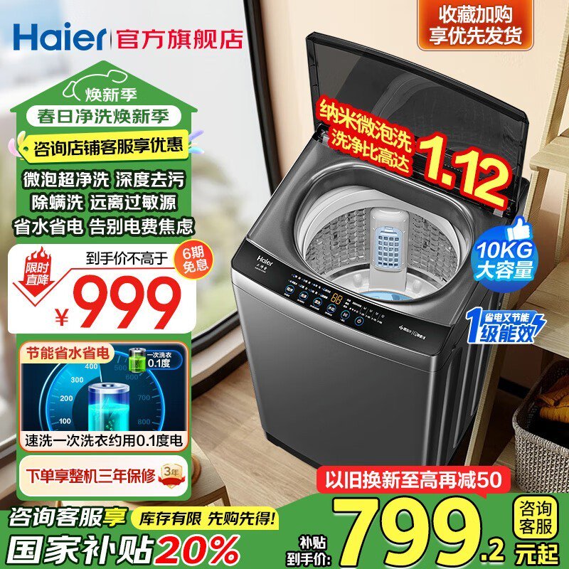 海尔XQB100-Z10E0波轮洗衣机10kg大容量强力去污仅653元